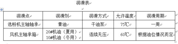 在日常運(yùn)行中,應(yīng)保證各潤(rùn)滑點(diǎn)充分潤(rùn)滑,并定期對(duì)粉分離器內(nèi)軸承和風(fēng)機(jī)軸承進(jìn)行潤(rùn)滑(見下表)。在日常維護(hù)中,注意粉體分離器轉(zhuǎn)子的平衡。如發(fā)現(xiàn)異常振動(dòng),應(yīng)立即停機(jī)檢查原因,并可在運(yùn)行前繼續(xù)故障。